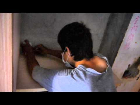 2.核對修整皮仔板,讓皮仔板跟牆邊的接縫密實。為了達到這個目的,我們會延著牆面把記號作在皮板上,接著再用電鋸切除記號上多餘的皮板。